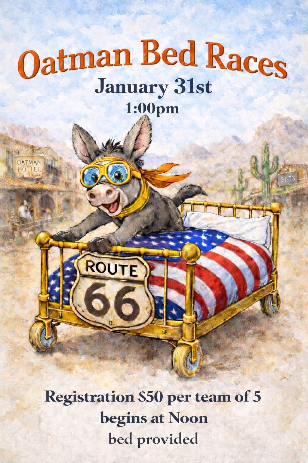 The Great Oatman Bed Races will take place on January 31st in Oatman, AZ. Teams of 5 (4 pushers and one sheet jockey) will race a special Oatman Bed Race bed at breakneck speeds down Main Street! Halfway through, the 4 pushers come to a screeching halt to properly make a bed before swinging a U-turn and dashing to the finish line. Fastest time wins. We provide the bed. Must be at least 18 yrs old to participate. Registration for teams begins the day of the event at Noon (AZ time). It is free to watch! You don't want to miss this zany Oatman Arizona Route 66 tradition!