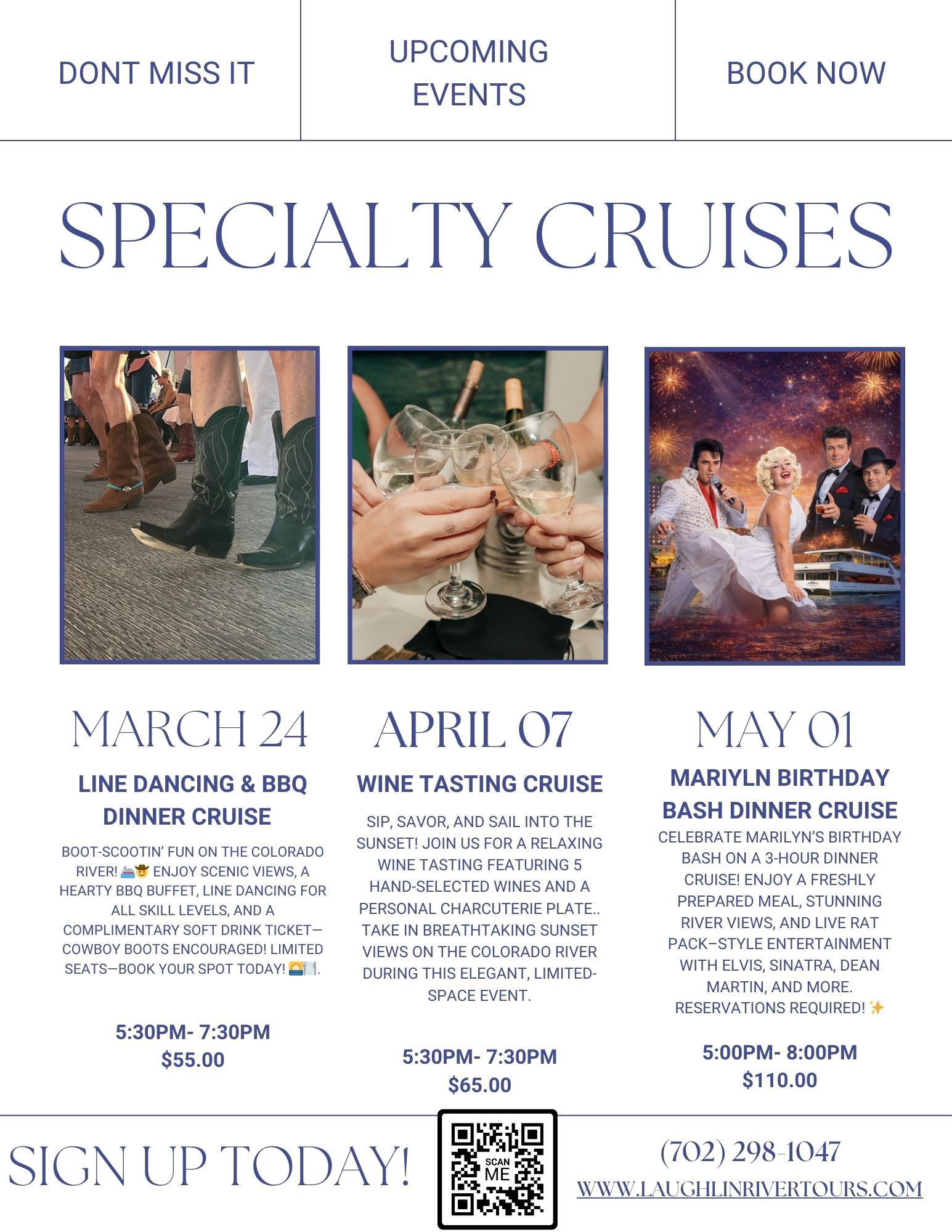 Celebrate in style with Rat Pack vibes, a 3 hour river cruise, 4-course dinner, and show-stopping entertainment.Limited Tickets available. Go to: https://laughlinrivertours.com/specialty-cruises/
