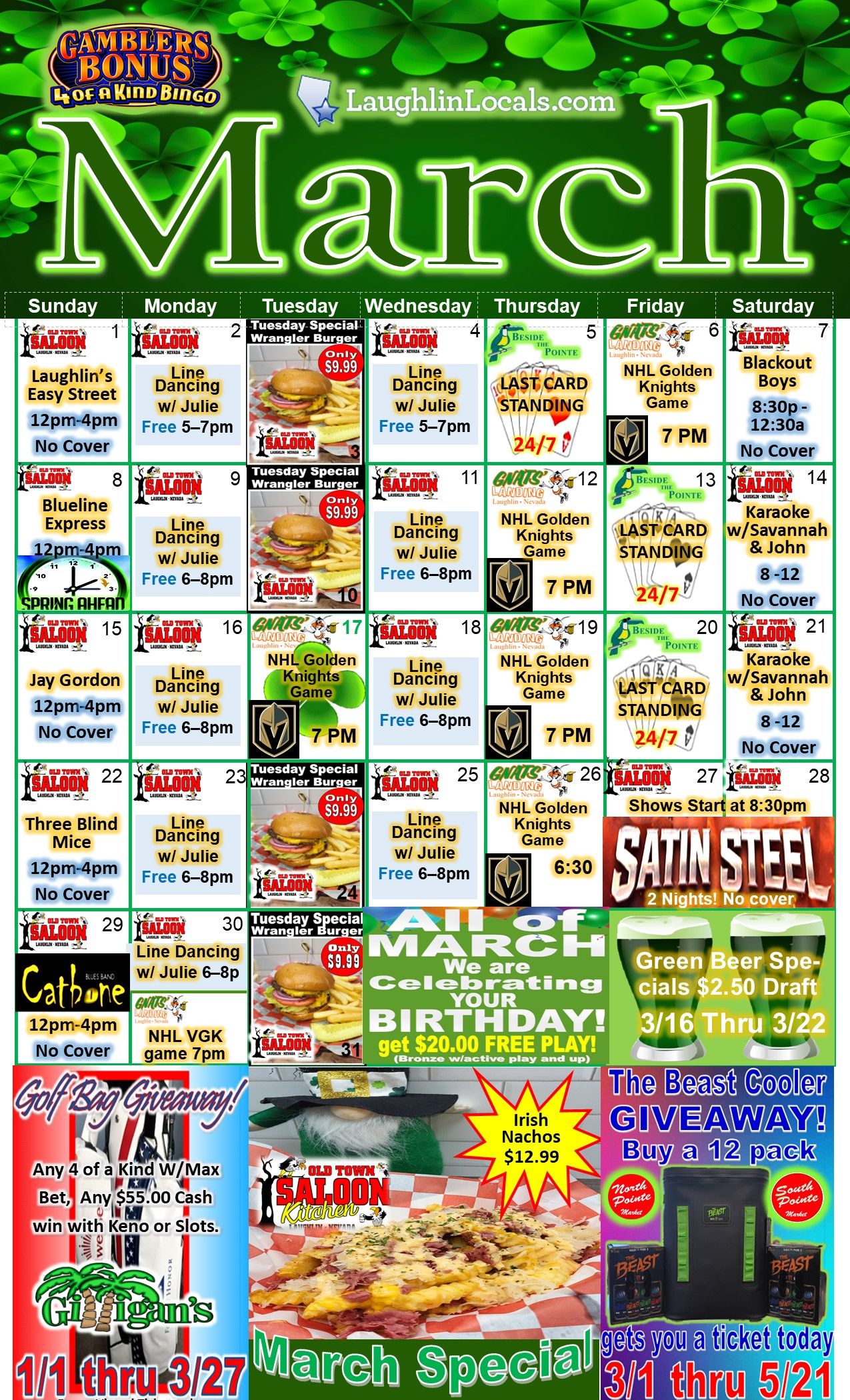 March Calendar showing events, specials and promotions at Old Town Saloon, Gilligan’s, Gnats’ Landing, and Beside the Pointe.