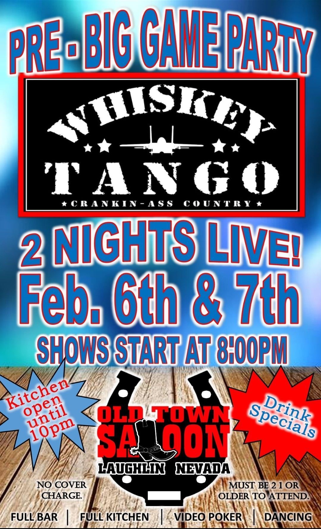 Old Town SaloonWhiskey Tango Pre-Big Game Party. 2 Nights Live! No cover charge, must be 21 or older, Gaming, Dancing, Drink specials Kitchen open! | Sunday, February 8th Super Bowl Party |