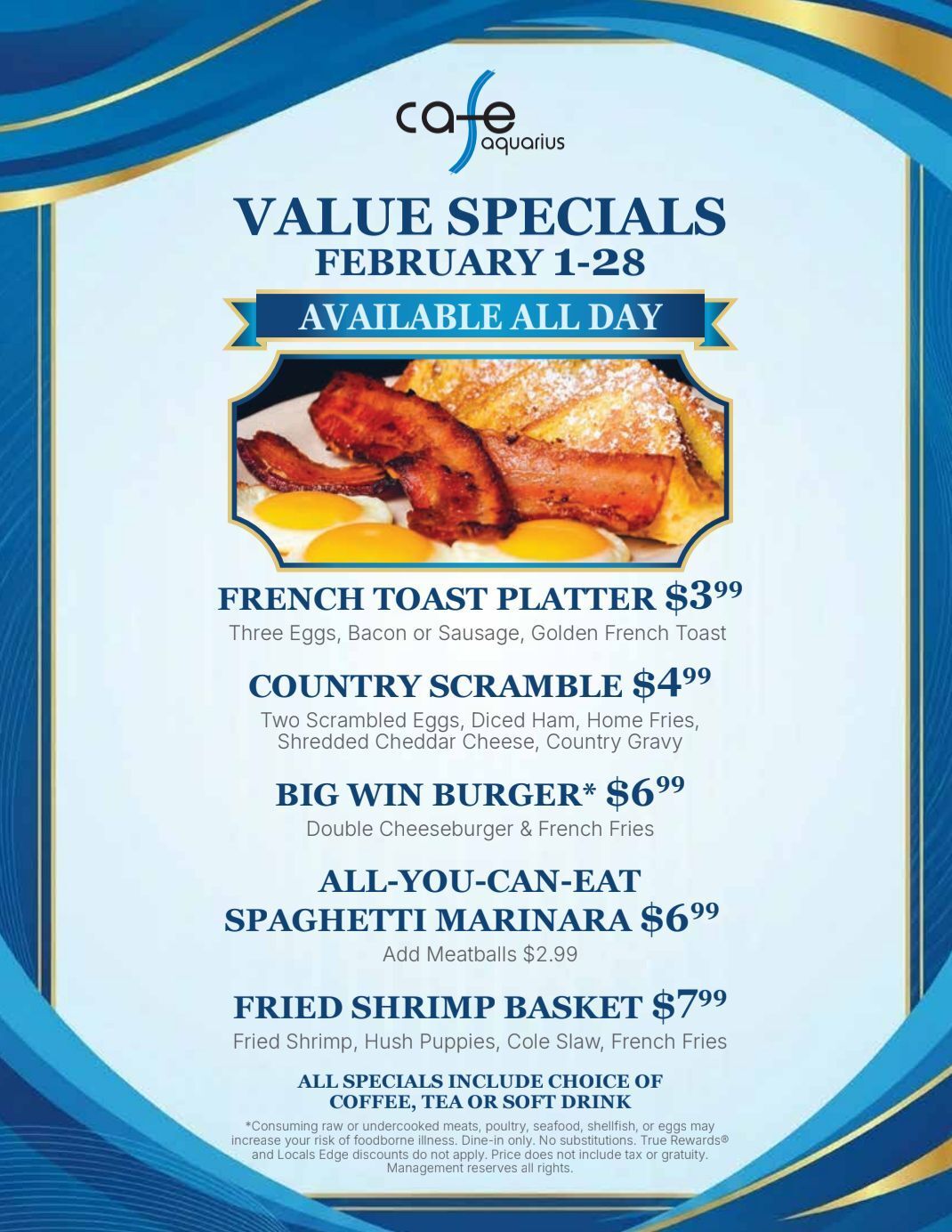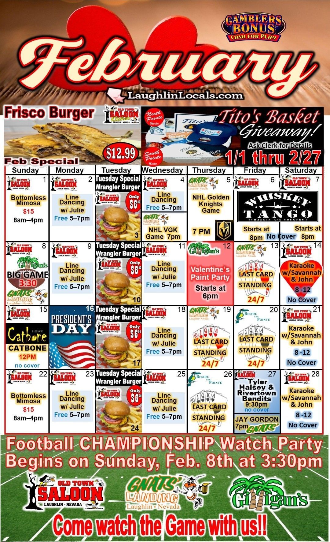 Check out the February Calendar showing events, specials and promotions at Old Town Saloon, Gilligan’s, Gnats’ Landing, and Beside the Pointe.